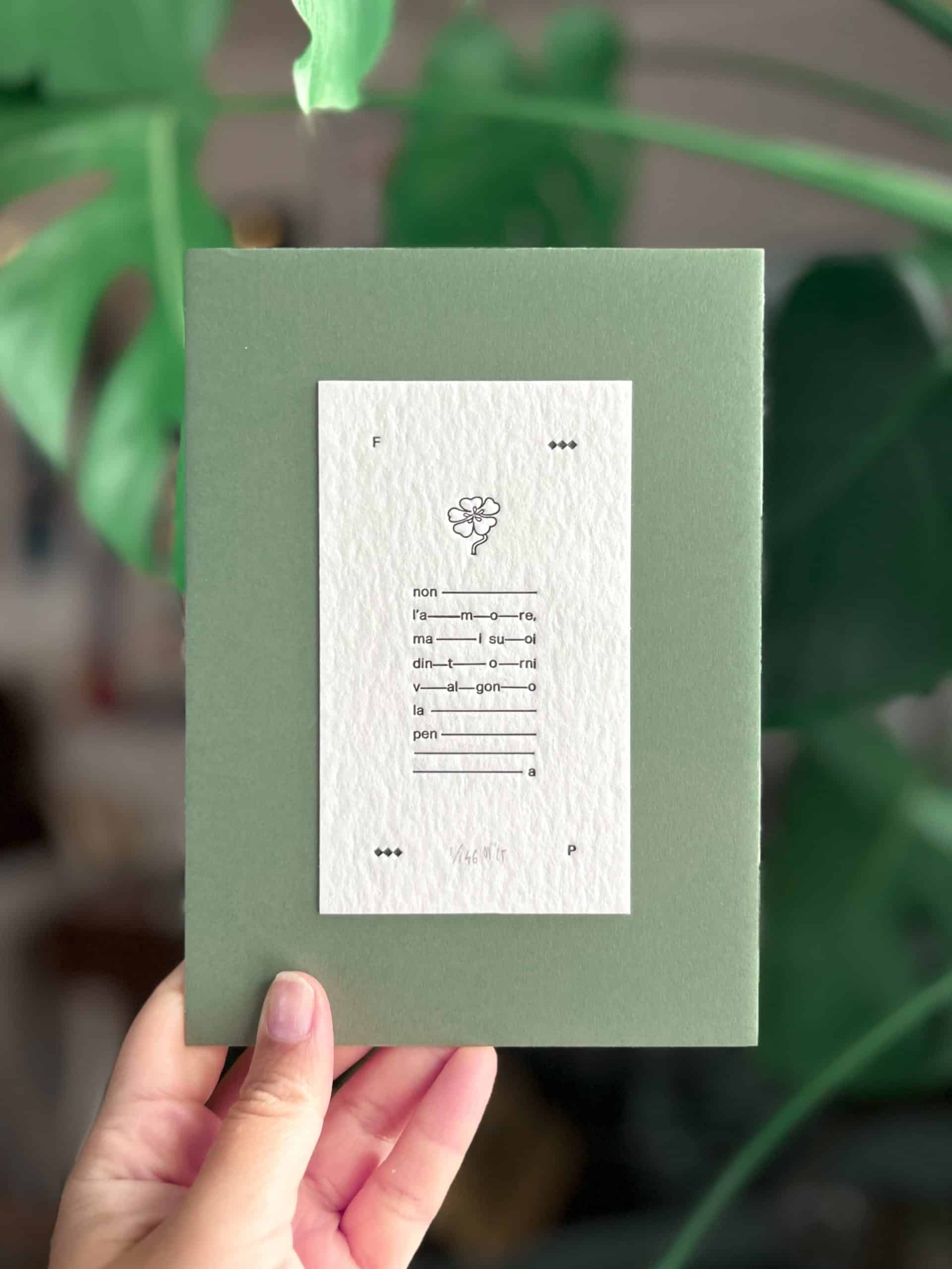 Un gioco di equilibri e incastri molto complessi, che danno vita a tre stampe da leggere lentamente, passando le dita su ogni singolo carattere impresso su carta.